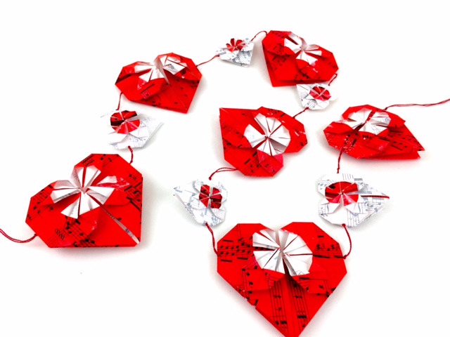kinard_origami_heart_garland4I have a collection of sheet music that I use for collage and origami projects. These pages were painted red on one side and white on the back.